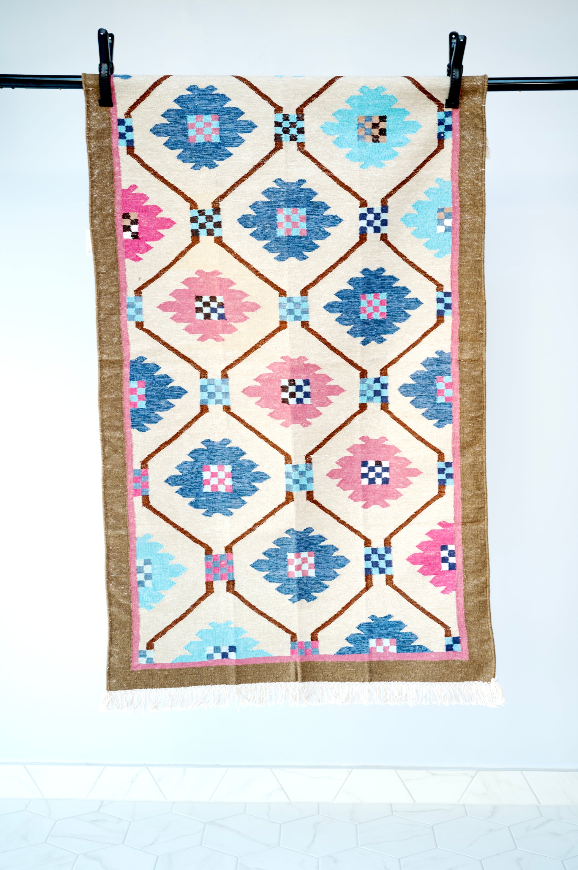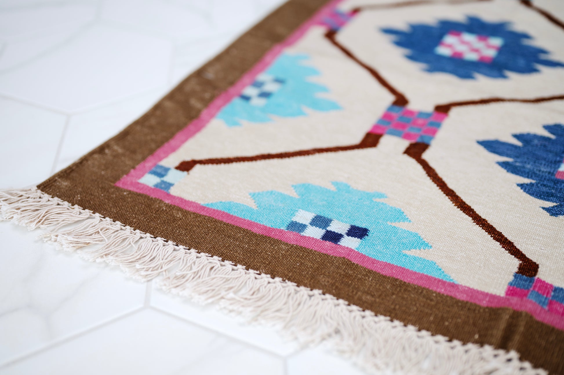 A versatile mid-size rug, this 5x3 foot (approx. 150 x 90 cm) dhurrie is perfect for smaller living spaces, kitchens, or at the foot of a bed. Its size strikes a balance — large enough to make a statement, yet easy to place anywhere in your home. Handcrafted over weeks by skilled artisans, it’s not just a rug but a story woven into every fibre. As each rug is handmade, sizes may vary slightly.